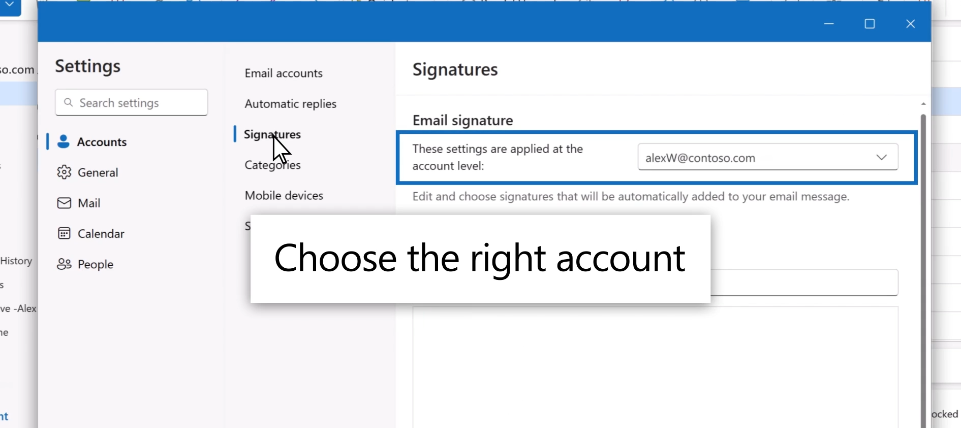 3: If you have more than one account added to new Outlook, select the account you want to apply your email signature to.