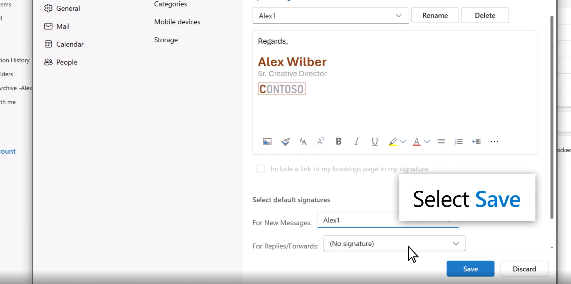 6: Use the checkboxes at the bottom to choose whether to apply the signature to new messages and to replies and forwards. Or leave them blank and add the signature you want when composing a message.
